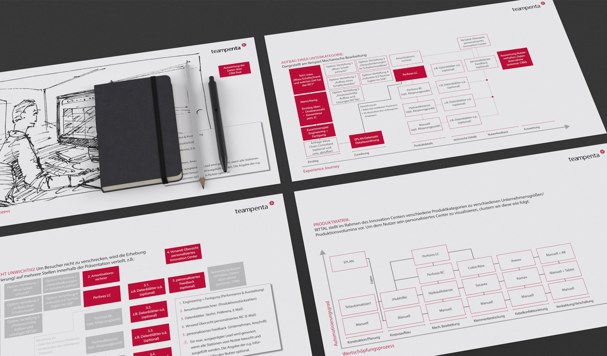 In Wireframes wurden Experience Journeys entlang des gesamten Wertschöpfungsprozesses abgebildet. Diese splitteten sich aufgrund der Vielzahl der zu vermittelnden Information in forcierte (zum Grundverständnis essentielle) Bereiche und optionale Vertiefungen auf. So ergaben sich diverse User Journeys, die ein Durchlaufen des Innovation Centers in 10-120 Minuten ermöglichten und alle in einem späteren "Aha-Effekt" mündeten. Ein weiteres Feature sah vor, das digitale Innovation Center personalisieren zu können. Somit konnte der Besucher "sein persönliches Erlebnis" via Link Sharing nochmals zu Hause erleben. Rittal konnte zudem an diversen Knotenpunkten der User Journey Informationen aus dem Nutzerverhalten erlangen.